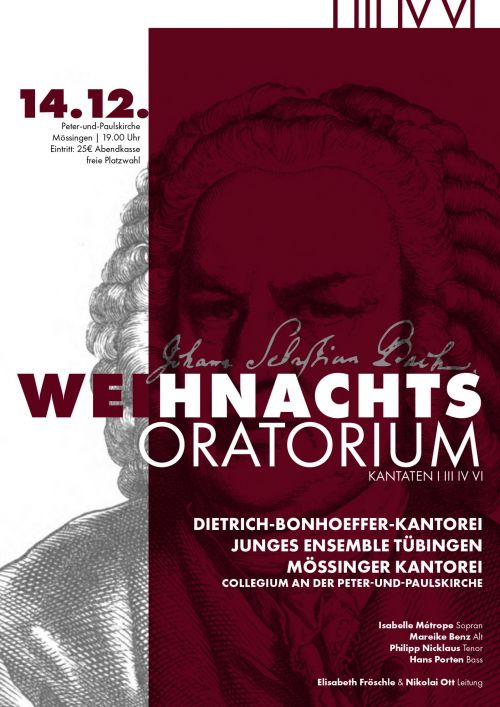 Für manche Menschen, darunter den örtlichen Kantor, kann es nur richtig Weihnachten werden, wenn man mindestens drei Kantaten aus Bachs Weihnachtsoratorium live gehört hat. Damit Sie dieses Jahr nicht so weit fahren müssen, hat die Mössinger Kantorei zusammen mit dem Chor der Dietrich-Bonhoeffer-Kirche gleich vier WO-Kantaten vorbereitet. Zwar in abenteuerlicher Konstellation (1,3,4,6) aber nicht minder begeisternd. Begleitet werden die ca. 80 Sängerinnen und Sänger von einem Barockorchester (Konzertmeisterin: Katja Schönwitz) und den vier Solisten Isabelle Métrope, Mareike Benz, Philipp Nicklaus und Hans Porten.