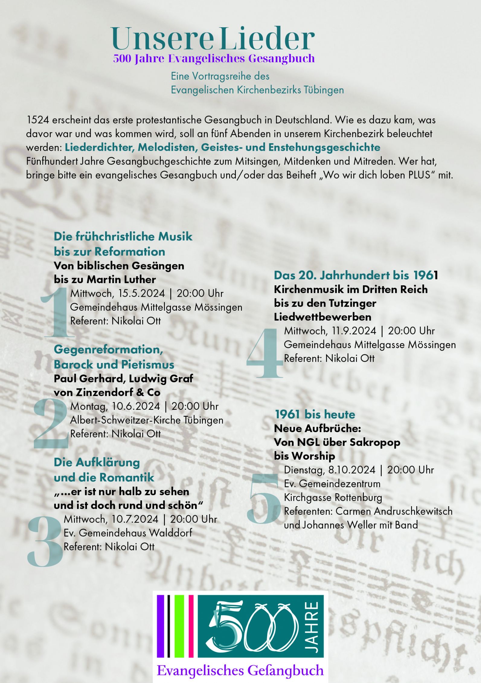 1524 erscheint das erste protestantische Gesangbuch in Deutschland. Wie es dazu kam, was davor war und was kommen wird, soll an fünf Abenden in unserem Kirchenbezirk beleuchtet werden. Fünfhundert Jahre Gesangbuchgeschichte zum Mitsingen, Mitdenken und Mitreden.