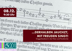 Von Nikolai Ott 08 Dez Singgottesdienst am 2. Advent 500 Jahre Gesangbuch | Singgottesdienst am 2. Advent | 09:30 Uhr | Peter-und-Paulskirche Mössingen Weiterlesen … Singgottesdienst am 2. Advent
