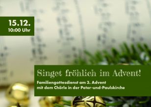 Von Katharina Gurski 15 Dez Familiengottesdienst am 3. Advent Chörle und JMS Gesangsschüler:innen | Familiengottesdienst am 3. Advent | 10:00 Uhr | Peter-und-Paulskirche Mössingen Weiterlesen … Familiengottesdienst am 3. Advent