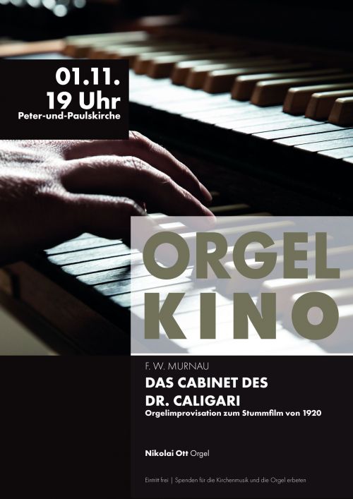 Herzliche Einladung zu einem ganz besonderen Orgelkonzert auf der frisch renovierten Weinmar-Orgel der Peter-und-Paulskirche. Als man vor mehr als einhundert Jahren Stummfilme in den Kinos gezeigt hat, war es Gang und Gäbe, dass Pianisten oder ganze Kinoorchester Filme begleitet haben. Mit der Ära des Tonfilms wurde das obsolet, doch wir wollen die goldenen 20er am 1. November um 19:00 Uhr noch einmal aufleben lassen. Bezirkskantor Nikolai Ott wird zu Friedrich Wilhelm Murnaus Meisterwerk „Das Cabinet des Dr. Caligari“ auf der Orgel improvisieren und denn Stummfilm in Echtzeit mit Musik untermalen. Für Getränke und Popcorn ist gesorgt, kommen Sie einfach vorbei und versetzen Sie sich für eine gute Stunde wieder in die Welt des beginnenden 20. Jahrhunderts!