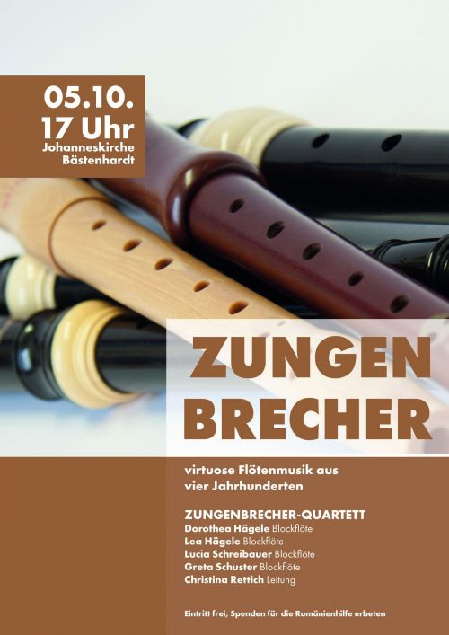 Am Sonntag, den 5. Oktober um 17:00 Uhr bringen vier junge Preisträgerinnen des Bundeswettbewerbs „Jugend musiziert“ die Johanneskirche Bästenhardt zum Klingen. Das Zungenbrecher-Quartett, vier Schülerinnen der JMS Steinlach, das einen dritten Preis beim Wettbewerb errang, bringt unter Leitung von Christina Rettich Werke von Antonio Vivaldi, Wolfgang Amadé Mozart, Sören Sieg, Paul Leenhouts u.a. zur Aufführung. Der Eintritt ist frei, eine Spende zugunsten der Rumänienhilfe herzlich erbeten.